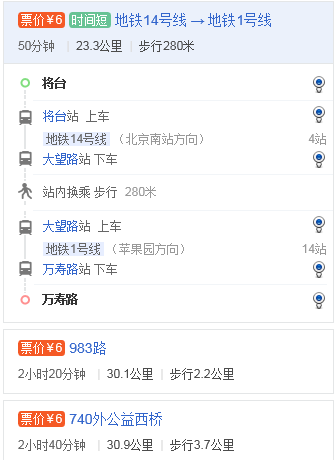 將臺(tái)路到海淀萬壽路23.3公里,坐地鐵14號(hào)線4站,到大望路站轉(zhuǎn)地鐵一號(hào)線14站到達(dá)。具體位置和線路如圖所示。